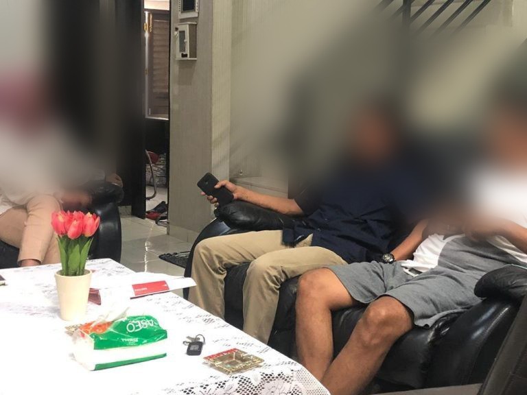 Dilansir dari foto itu terdapat seorang perempuan memakai hijab warna pink duduk didekat pintu. Dan didampingi 2 orang pria, salah satunya menggunakan celana pendek disebut sebut Pelapor.