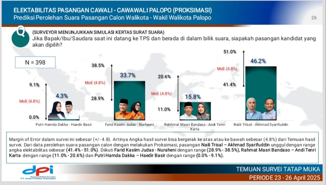 Untuk diketahui, PT. Duta Politik Indonesia menggelar survei pada tanggal 23 hingga 26 April 2025, Dengan melibatkan 400 responden.