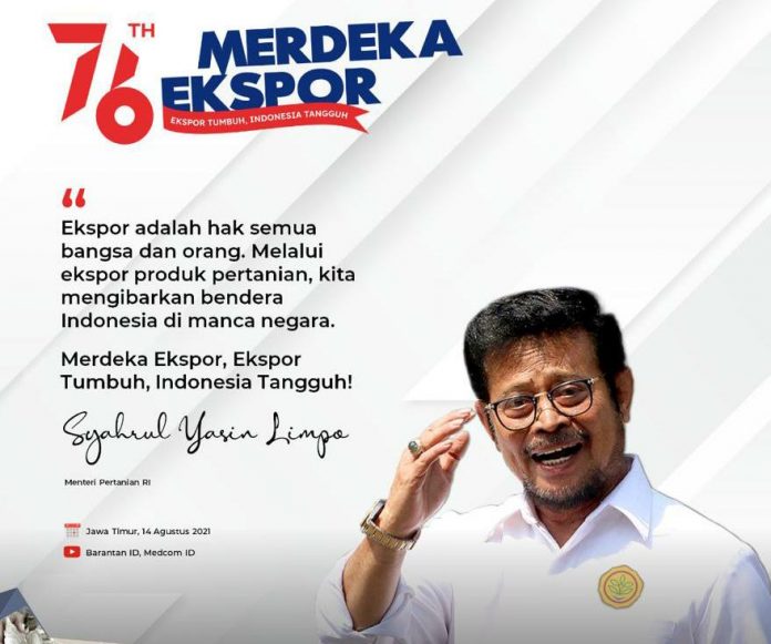 Sebagai bagian dari momentum Hari Kemerdekaan RI, Kementan menyelenggarakan #MerdekaEkspor pada 14 Agustus 2021. Selain bentuk apresiasi bagi pelaku usaha di bidang agribisnis, Merdeka Ekspor diharapkan dapat menambah semangat petani dan pemangku kepentingan pertanian nasional.