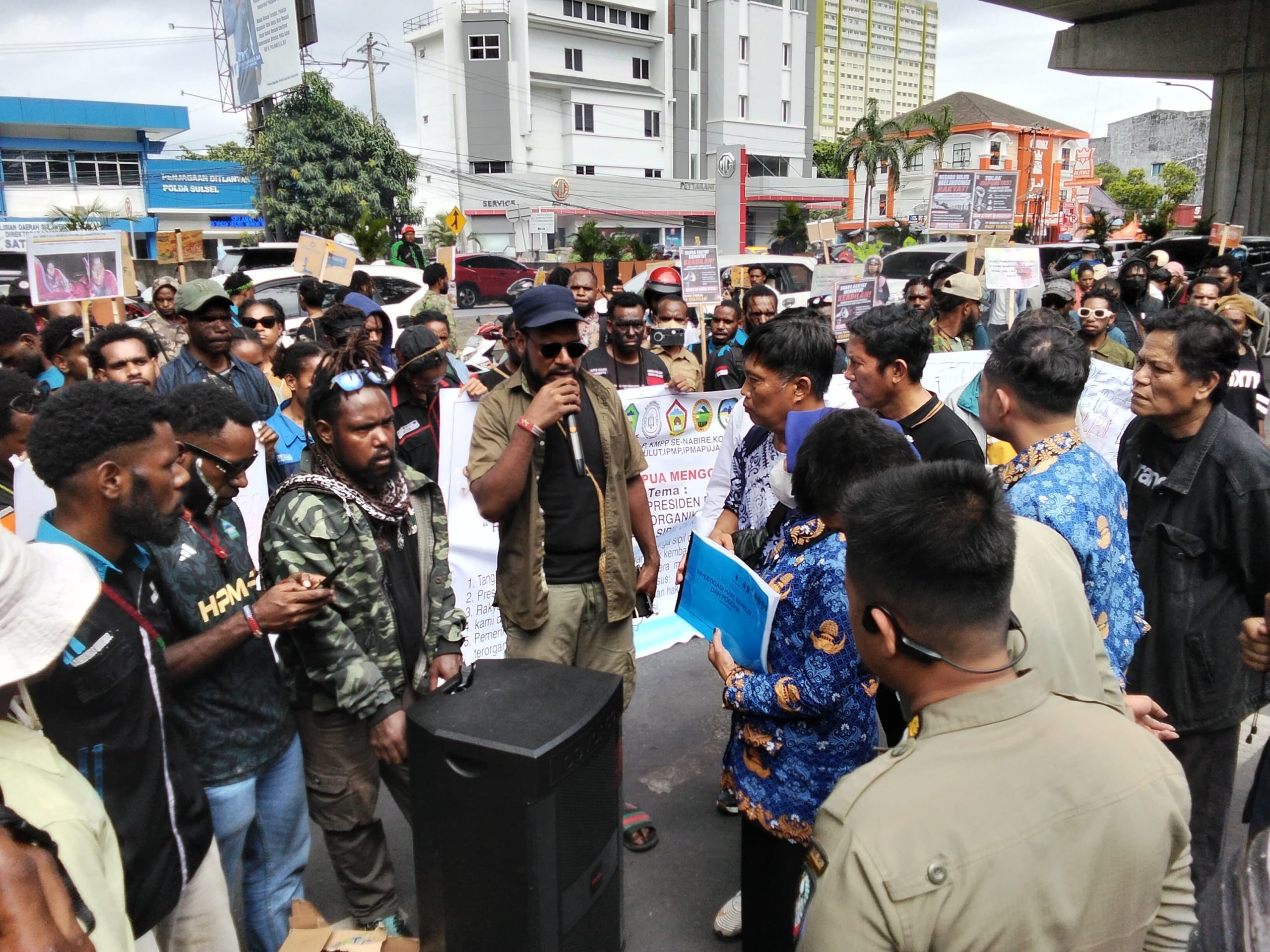 Massa aksi datang dengan membawa spanduk, poster, serta pengeras suara yang berisi tuntutan agar pemerintah pusat segera menarik pasukan TNI non-organik dari wilayah konflik tersebut. Mereka juga menuntut agar aparat yang diduga terlibat dalam peristiwa yang menyebabkan 10 warga sipil meninggal dunia segera ditangkap, dipecat dari institusi, dan diadili secara transparan sesuai hukum yang berlaku.
