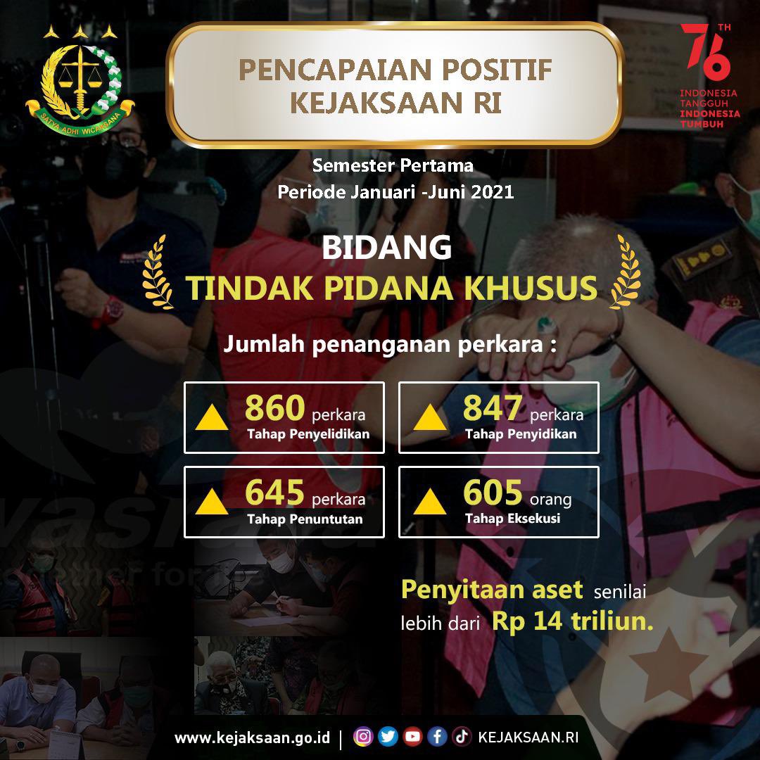 Capaian Kinerja Bidang Tindak Pidana Khusus. Jumlah penanganan perkara yang telah dilakukan yaitu pada tahap Penyelidikan 860 (delapan ratus enam puluh) perkara, tahap Penyidikan 847 (delapan ratus empat puluh tujuh perkara), dikutip dari akun twitter @KejaksaanRI. Rabu malam