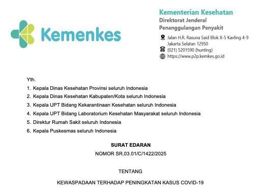 LEGIONNEWS.COM – Kementerian Kesehatan (Kemenkes) menerbitkan Surat Edaran (SE) Nomor SR.03.01/C/1422/2025 tentang Kewaspadaan Terhadap Peningkatan Kasus Covid-19.