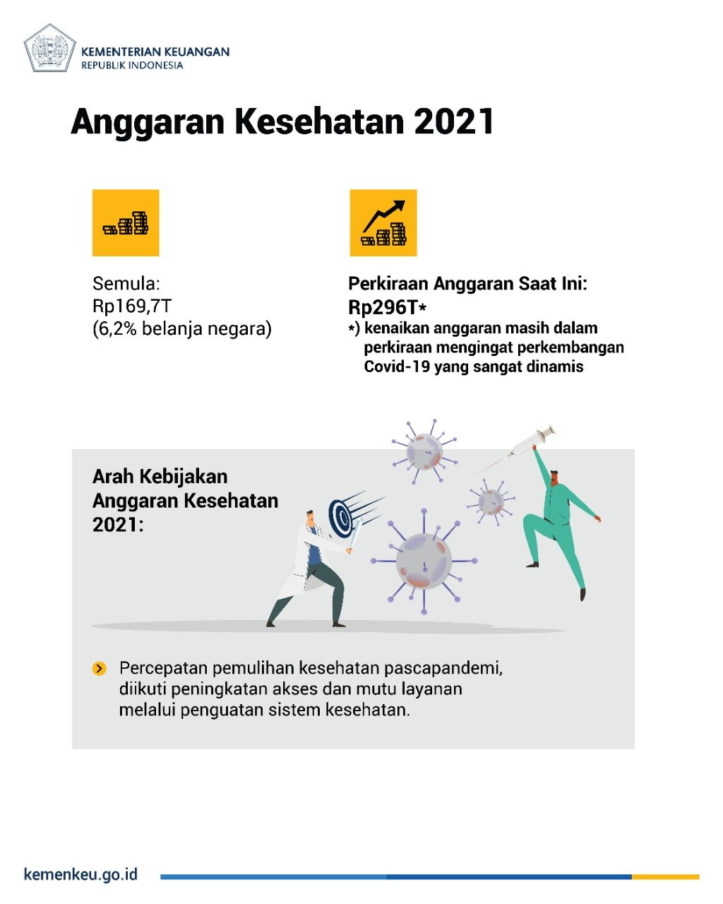 Ada kenaikan anggaran dari tahun lalu yang hanya mencapai Rp169.7 triliun. Tahun ini menyentuh angka Rp296 triliun namun masih dalam perkiraan mengingat perkembangan COVID19 yang sangat dinamis. Sumber informasi Kementerian Keuangan RI, melalui laman akun media sosial. (Ln)