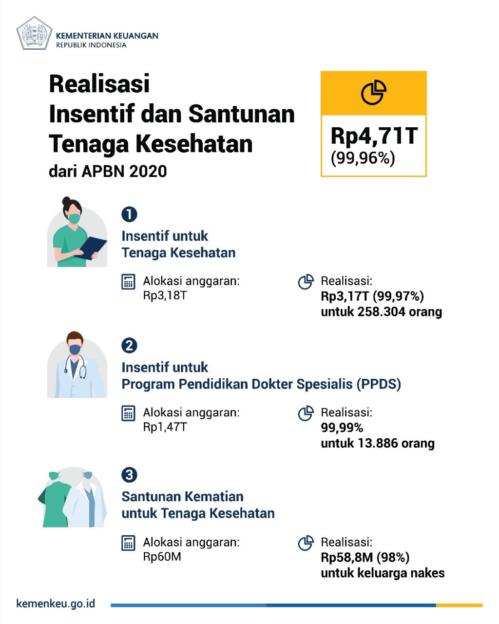 Tahun 2020 lalu, realiasi insentif dan santunan bersumber dari APBN 2020 yang terserap Tenaga Kesehatan (Nakes) alokasi anggaran Rp3,18 triliun, realisasi mencapai Rp13,17 triliun, dengan capaian serapan 99,97 persen, untuk 258.304 orang