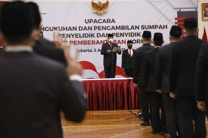 JAKARTA, Legion-news Komisi Pemberantasan Korupsi atau KPK menggelar Upacara Pengukuhan dan Pengambilan Sumpah Penyelidik dan Penyidik KPK di Aula Gedung Juang Merah Putih. Selasa, 3 Agustus 2021.
