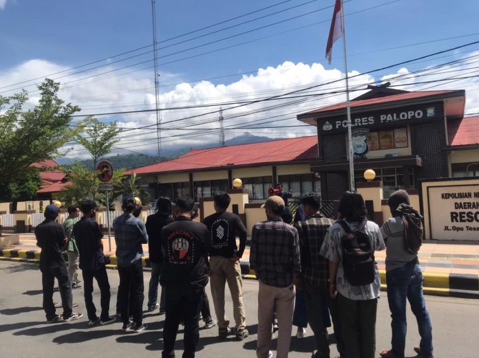 Puluhan mahasiswa dari Aliansi Mahasiswa Ungkap Kasus (AMUK), melakukan aksi demonstrasi di depan Polres Kota Palopo, berorasi sambil membawa tiga poin tuntutan.
