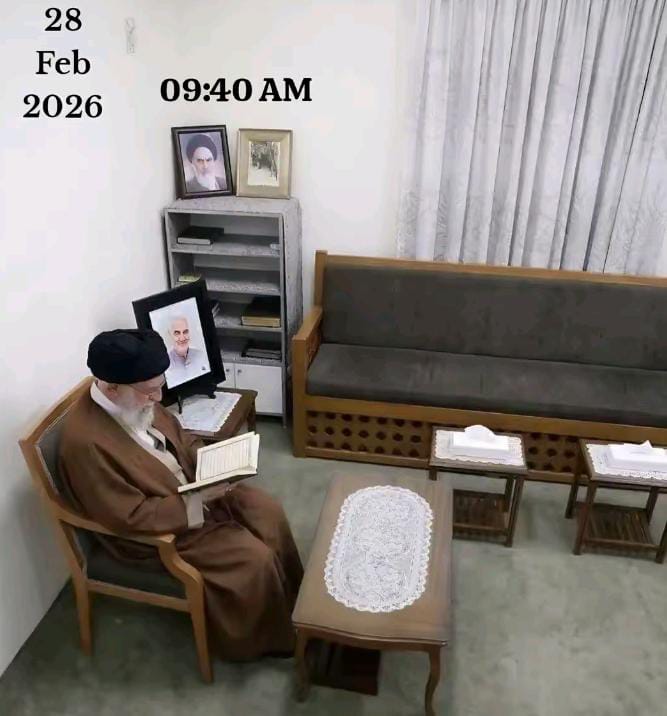 la terlihat sedang membaca Al-Qur’an. Di atas meja di sampingnya, terdapat bingkai foto Qasem Soleimani, komandan yang ia tangisi, martir yang tak henti-hentinya ia muliakan. Di rak di belakangnya, terdapat foto Imam Khomeini, pendiri revolusi, yang warisannya ia emban selama 35 tahun.