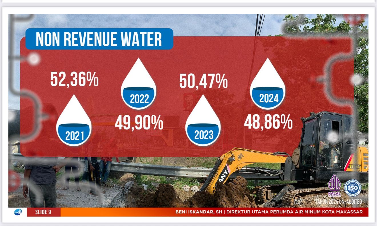 Dalam keteranganya soal NRW, Kata Dirut Keuangan PDAM Makassar itu mengatakan, Berdasarkan catatan perusahaan, kondisi NRW saat ini kurang lebih sama dengan tahun sebelumnya.