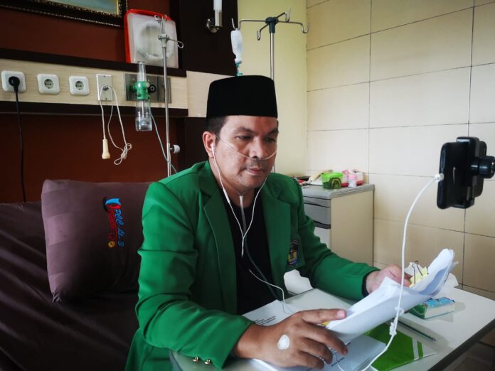 UJIAN. Dr Wachyudi Muchsin SH mengukuti ujian program Magister Kesehatan Pascasarjana (S2) Universitas Muslim Indonesia (UMI) Makassar via Zoom meeting di PCC RSUP Dr Wahidin Sudirohusodo Makassar, Kamis (4/2/2021). foto: istimewa
