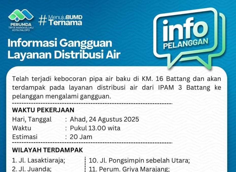 PALOPO – Perumda Tirta Mangkaluku (PAM) Kota Palopo mengumumkan adanya gangguan distribusi air bersih akibat kebocoran pipa air baku di Kilometer 16 Battang.