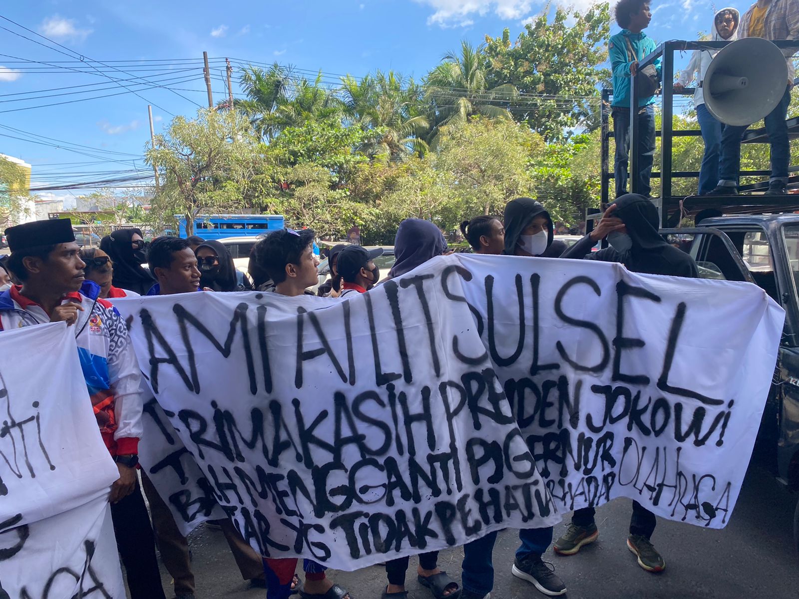 Spanduk itu bertuliskan, “Kami atlet sulsel berterima kasih Presiden Jokowi, telah mengganti Pj Gubernur Bahtiar yang tidak peduli pada olahraga di Sulawesi selatan”.