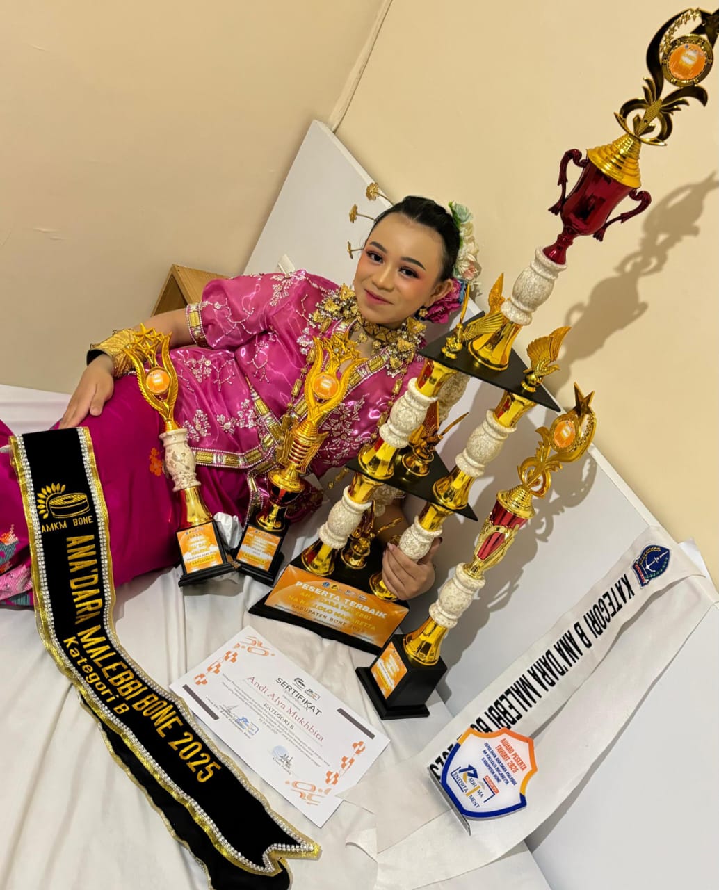 Andi Alya mengikuti event Ana’ dara malebbi na kalolo magaretta kabupaten Bone 2025. Dia berhasil meraih piala dan penghargaan.