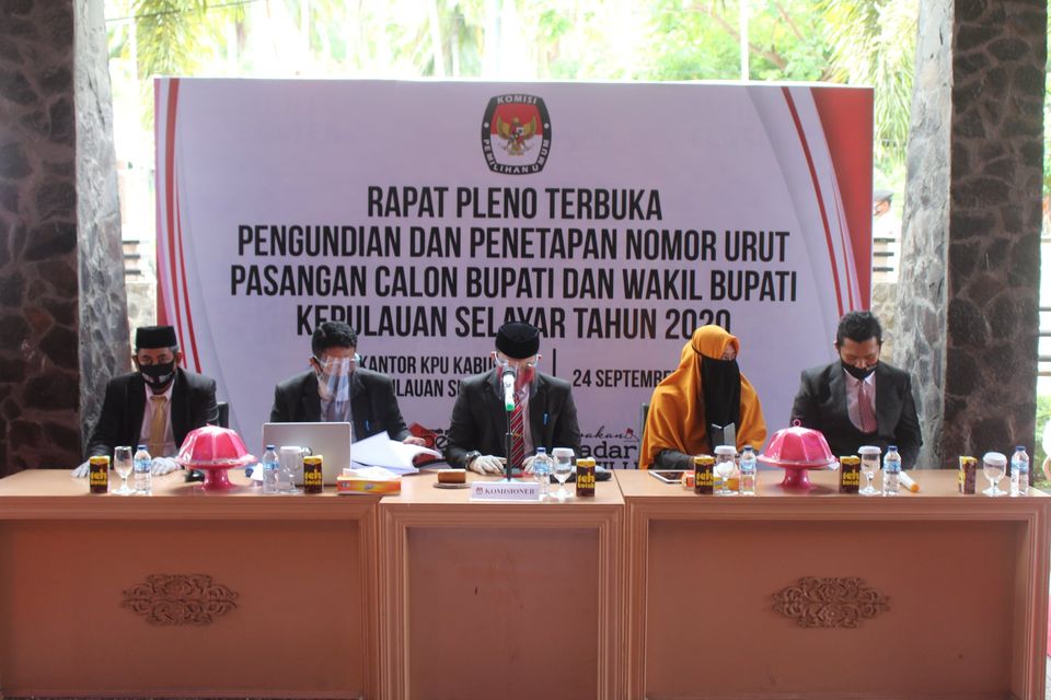 Mendasari petunjuk dan tuntutan perkembangan situasi terkini, design pengundian, pencabutan, dan penetapan nomor urut yang semula direncanakan akan dipusatkan, di ruang pola kantor bupati, harus digeser ke pelataran halaman kantor KPU dengan melakukan pembatasan dari jumlah awal lima puluh orang rombongan, tinggal menjadi sepuluh orang, termasuk paslon dan istrinya, terangnya, di hadapan tim forum komunikasi pimpinan daerah (Forkopimda) yang menghadirkan, Kapolres Kepulauan Selayar, AKBP. Temmangnganro Machmud, SIK, Kepala Kejaksaan Negeri, Adi Nuryadin Sucipto S.H., M.H, Ketua Pengadilan Negeri, Muchammad Faktur Rachman, S.H., M.H., Dandim 1415/Selayar, Letkol Kav. Adi Priatna, dan Sekretaris Daerah, Dr. Ir. Marjani Sultan, M.Si.