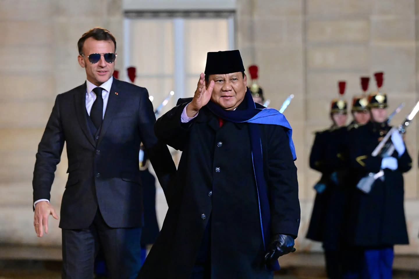 Setibanya di halaman Istana Élysée, Presiden Prabowo disambut langsung oleh Presiden Macron. Prosesi penyambutan berlangsung khidmat dengan kehadiran Pasukan Jajar Kehormatan serta alunan detasemen musik yang mengiringi langkah Presiden Prabowo ketika turun dari kendaraan.