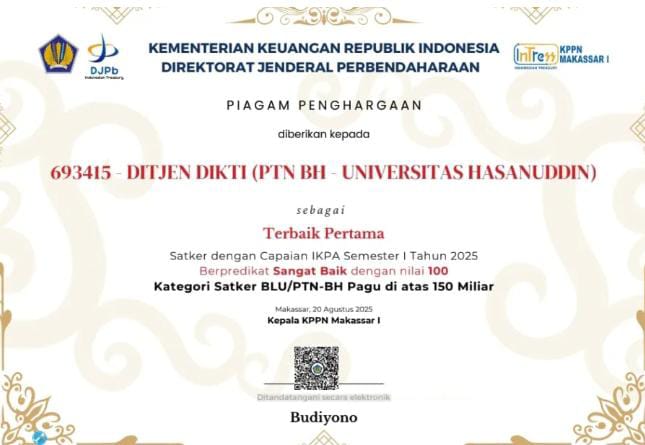 Penilaian dilakukan berdasarkan capaian Indikator Kinerja Pelaksanaan Anggaran (IKPA) Semester I Tahun 2025, dan Unhas memperoleh skor sempurna 100 dengan predikat Sangat Baik.