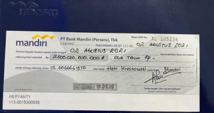 Beredar foto bilyet giro Bank Mandiri senilai Rp 2 triliun yang diduga terkait dengan cerita bantuan dari keluarga Akidi Tio ini.