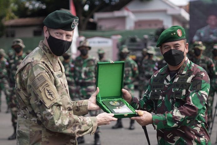 Wakasad Letjen TNI Bakti Agus Fadjari, S.I.P., M.Si bersama Commander of 25th Inf Div US Army Major General Joseph A. Ryan selaku Inspektur Upacara penutupan yang dipusatkan di lapangan upacara Puslatpur Kodiklatad, Baturaja. Sabtu, (14/8/2021).