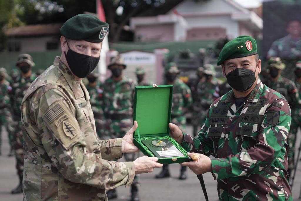 Foto (Kiri) Commander of 25th Inf Div US Army Major General Joseph A. Ryan dan (Kanan) Wakasad Letjen TNI Bakti Agus Fadjari, S.I.P., M.Si saat menerima tropi kenang-kenangan.