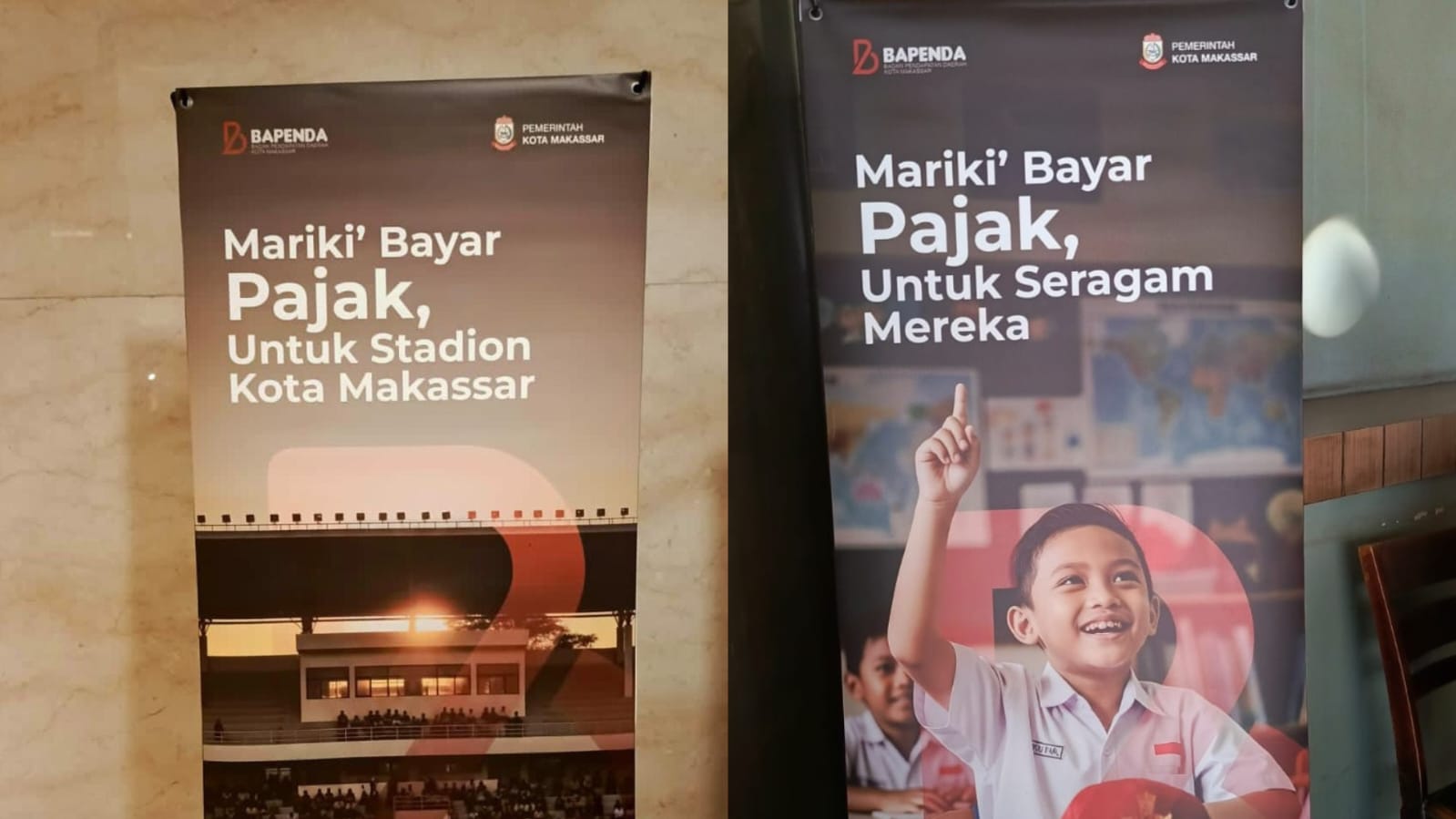 “Mari ki Bayar Pajak, Untuk seragam mereka,” tulis dua standing baner milik Bapenda Kota Makassar.